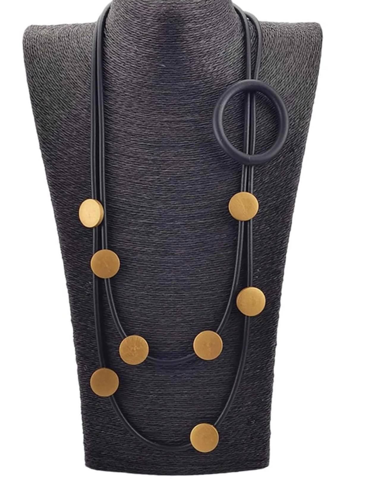 Smykke i sort gummi med gull detaljer