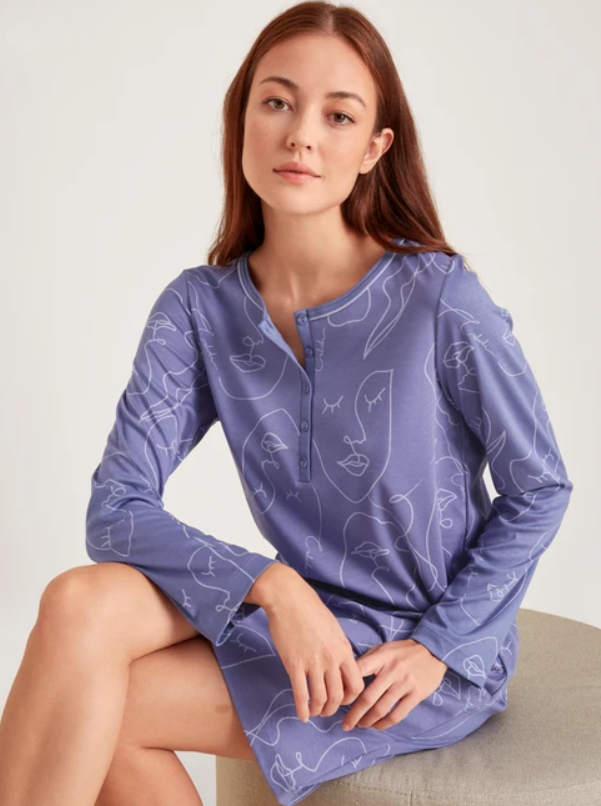 Beskrivelse Langermet nattkjole, moderne passform laget av 100% SUPIMA® bomull Interlock kvalitet Rund hals med knappefeste Med kvalitetsstempel for sveitsisk+bomull lengde 100 cm |