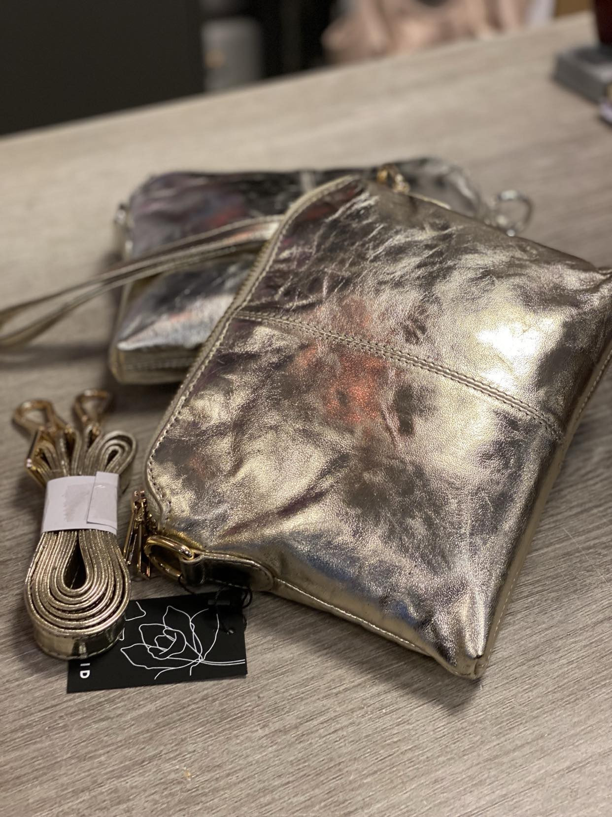 Beskrivelse Crossbody clutch i skinn med 2 rom med glidelås øverst. Vesken har en justerbar og avtakbar skulderstropp samt en håndleddsstropp som også kan fjernes. Innvendig har posen et rom med glidelås og en innsydd kortholder på den ene siden. Foret. Dimensjoner: Høyde: 19 cm, bredde: 23 cm | Skulderrem: lengde: 90 - 160 cm | Håndleddsstropp: lengde: 21 cm. Materiale: 100% Geiteskinn | Fôr: 100 % polyester Vask: Ikke vask |
