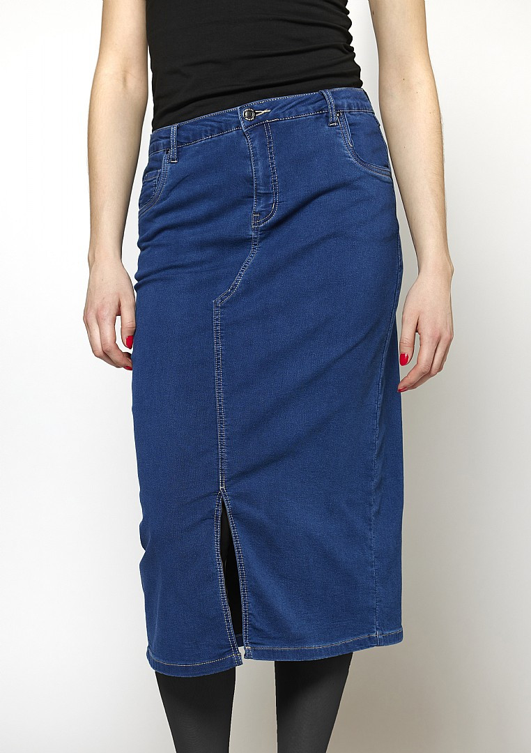 Et elegant og behagelig denim-skjørt med herlig stretch. Lengde i str 38 er 80cm 70%Bomull 27%Polyester 3%Elastan