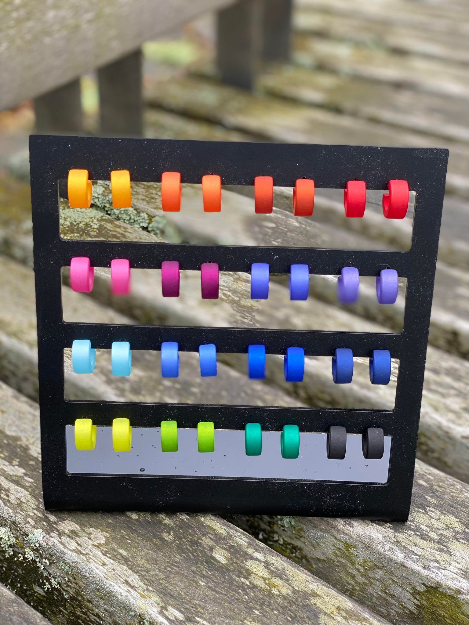 Beskrivelse Marie-Smykker sine nydelige øreringer. Disse er laget av harpiks, som er et naturprodukt. Finishen er matt. Nikkelfri Fargene øverst fra venstre til høyre : Gul, Oransje, Rust, Rød, Rosa, Purpur, Blåklokke, Lavendel, Lys Turkis, Blå, Kongeblå, Marine, Lime, Eplegrønn, Grønn, Sort. |