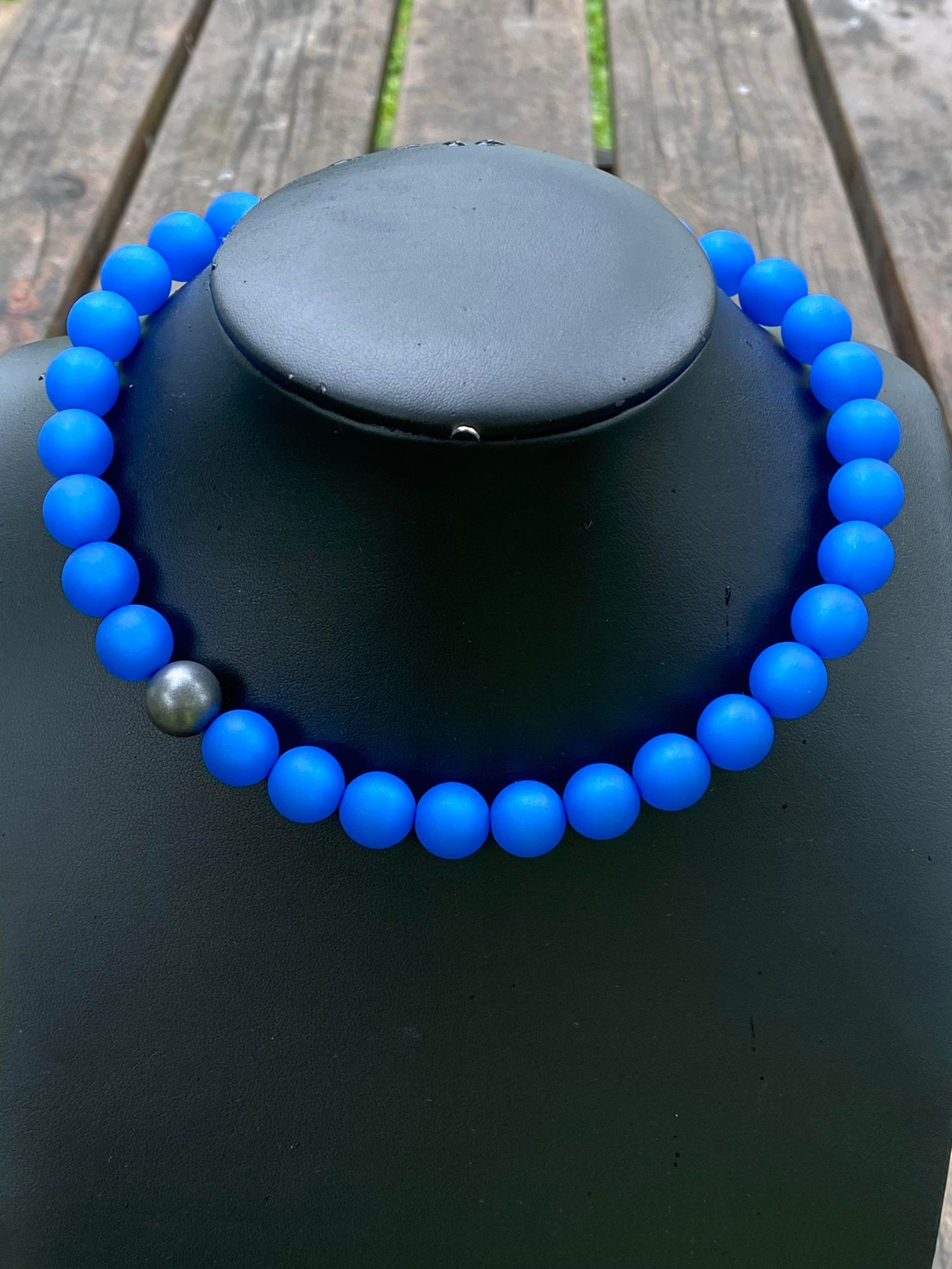 Beskrivelse Halskjede fra MARIA Smykker, laget av harpiks som er et naturmateriale. Kjedet er ca 43 cm langt pluss lenke til justering på ca 7 cm. Nikkelfritt Diameter på kulene er ca 1,2 cm. Matt Finish. |