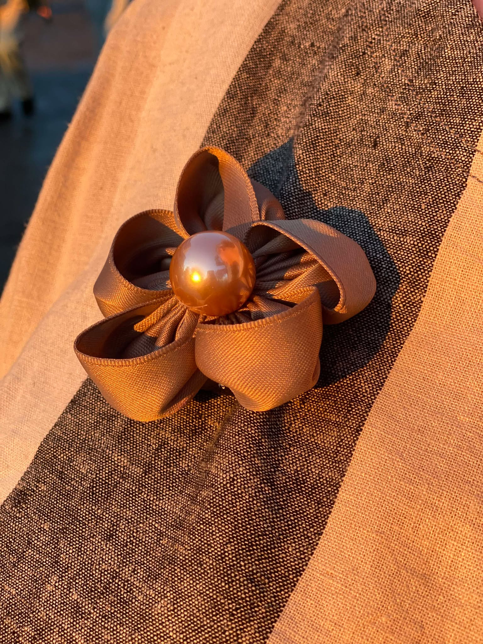 En nydelig rosett med perle som kan brukes både i hår og på klærne.