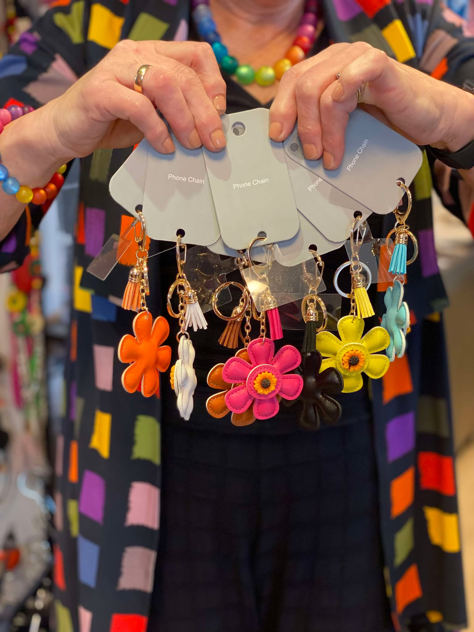 En morsom nøkkelring med blomst. Levers med plastikk, slik at den også kan brukes til pynt på mobilen.