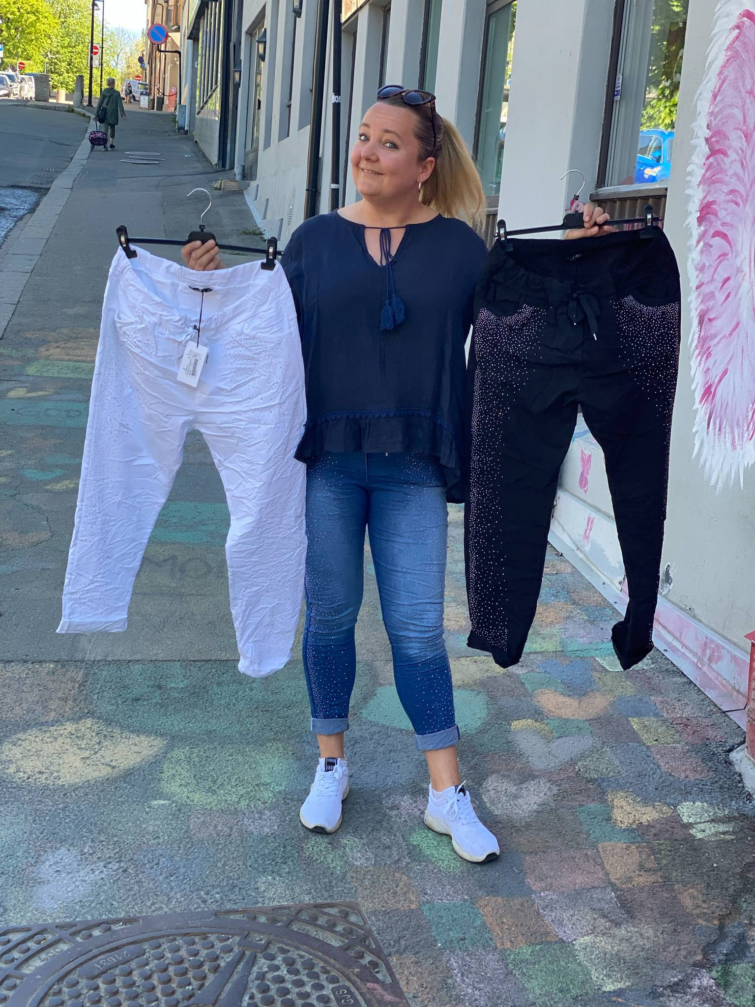 Deilig "bling"-bukse med god stretch. Denim kvalitet:75% Bomull 23% Polyester 2% Elastan Sort og hvit kvalitet: 95% Viskose 5% Elastan