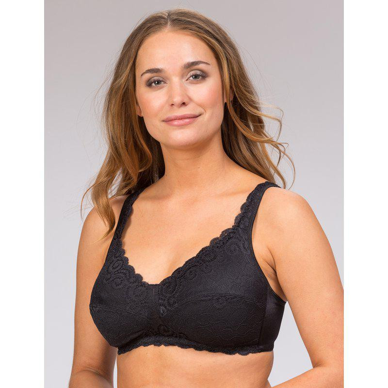 Beskrivelse Livia uten bøyle mastektomi, god, nydelig uten innlegg. Hele fronten er laget av myk og behagelig, vevd blonde, synlig gjennomsiktig mellom cupene. Blonden fortsetter opp på skulderstroppene. Ryggbånd i halvblankt stoff og justerbare skulderstropper. Lukkes bak. Cup Full dekning. Plass til proteser. Uten bøyle. Materiale 85 % polyamid, 15 % elastan |
