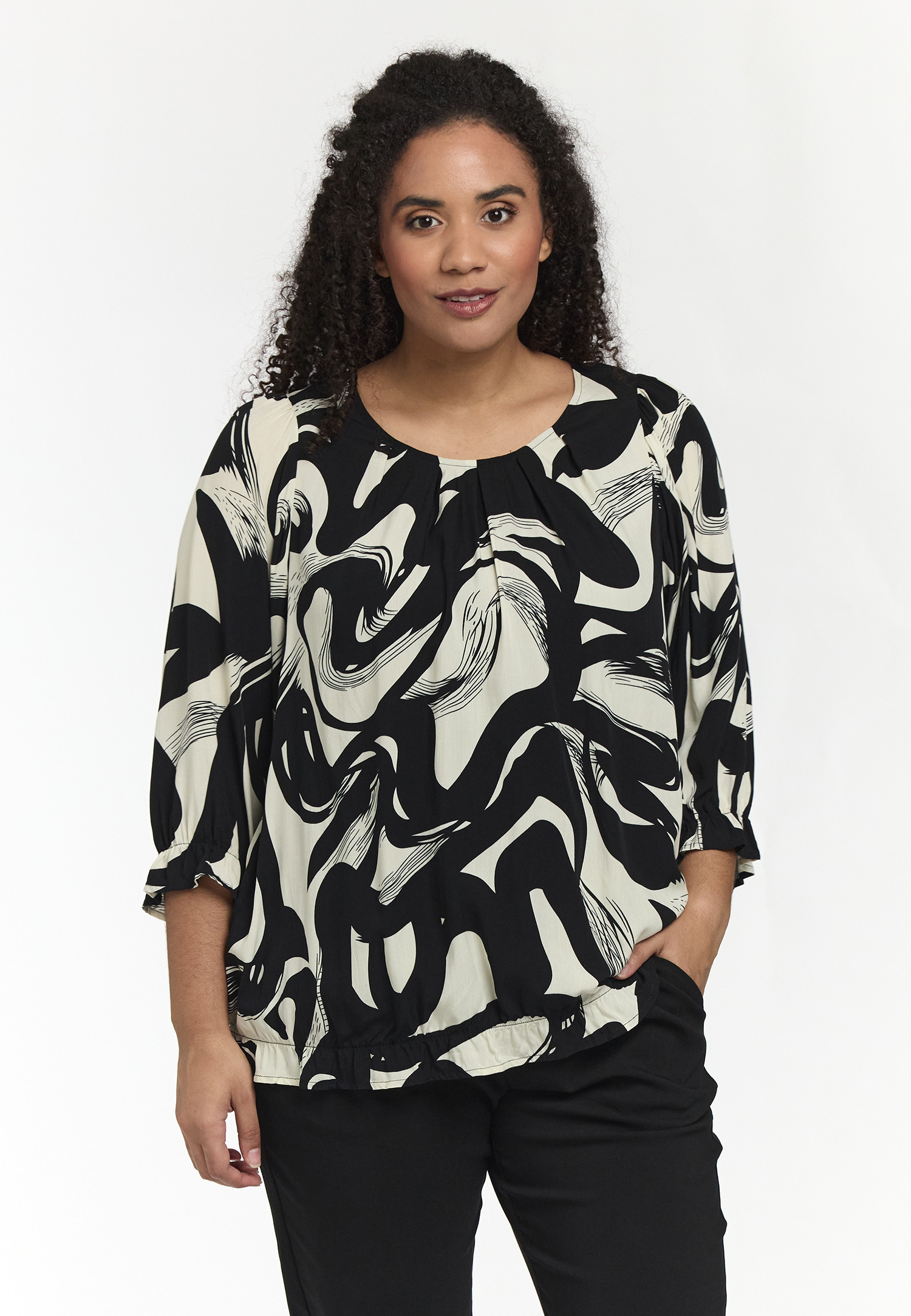 Beskrivelse En lett vevd bluse i 100 % viskose med et moderne, grafisk trykk i klassisk svart/hvit. Designet i en løs og komfortabel passform med rund hals og korte ermer, noe som gir et lett og avslappet utseende. Detaljer inkluderer: Rund hals. 3/4-ermer i løs passform. Rett, komfortabel silhuett med fint fall. Grafisk trykk som fremhever fargens karakter og gir et moderne utseende. Kvaliteten er lett, myk og pustende med et naturlig fall – perfekt for både kontor og hverdagsbruk. Mål for størrelse S: Halve brystvidde: 59 cm Lengde: 72 cm |