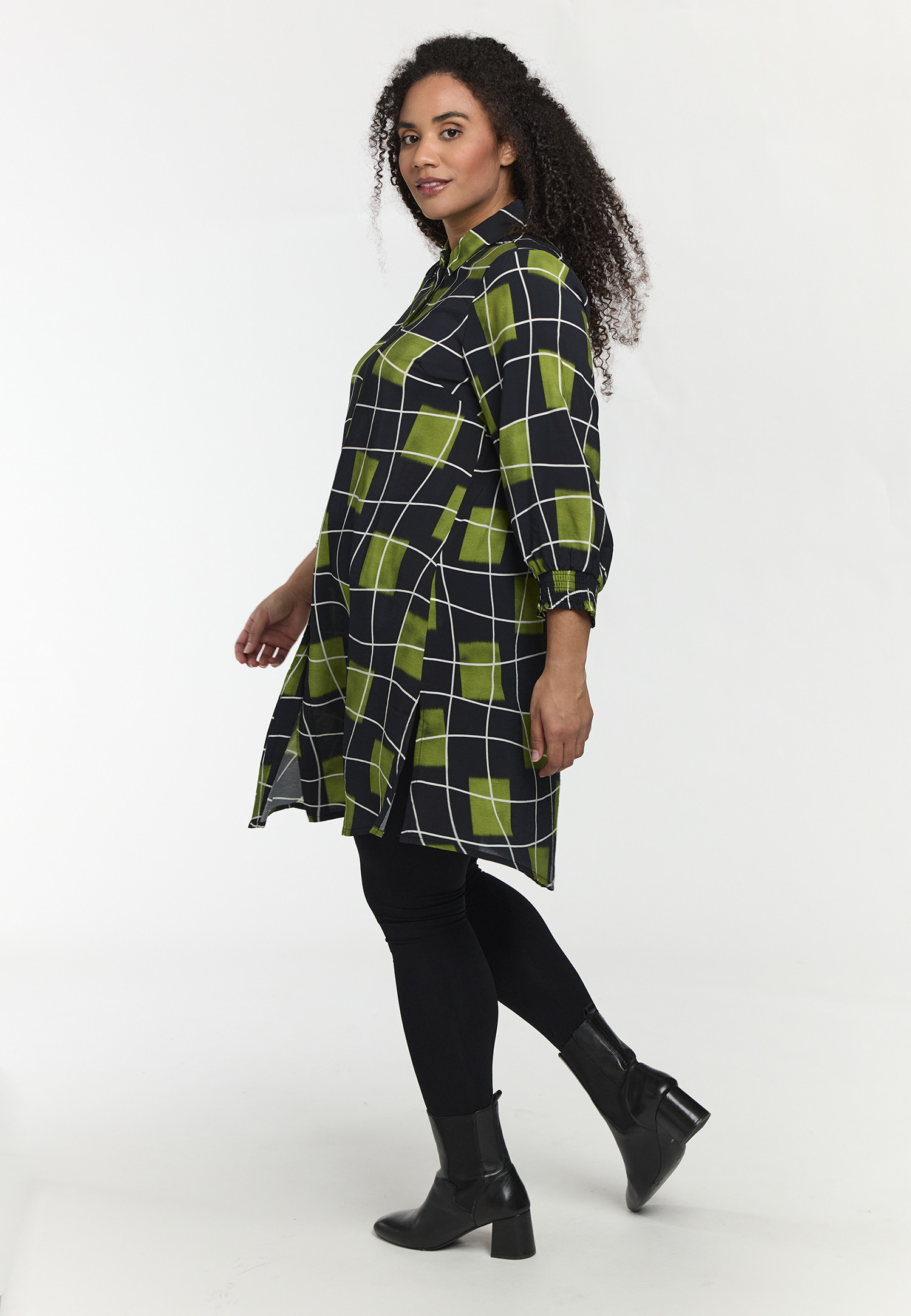 Beskrivelse En myk kjole i viskose med stretch, designet i en lett A-form med en myk V-hals og et feminint bobletrykk i grønne nyanser. Detaljer inkluderer: Myk V-hals med enkel finish. Lange ermer med rett kant. Løs, A-formet silhuett med komfortabelt fall. Mykt stoff med en lett struktur og en subtil glans. Kvaliteten føles smidig og pustende med god bevegelighet - ideell for både hverdagsbruk og festlige anledninger. Mål for størrelse S: Halve brystvidde: 56 cm Lengde: 125 cm |