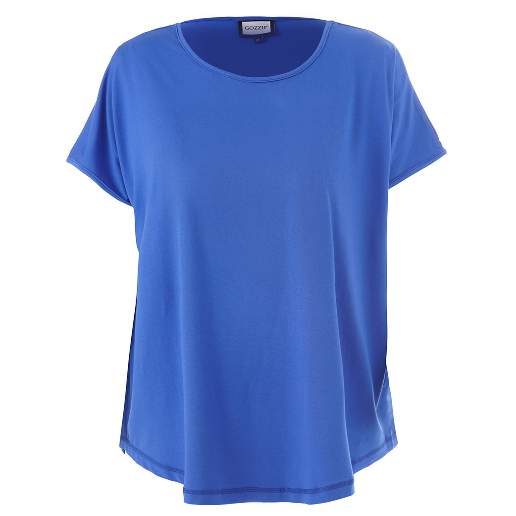 Ensfarget t-skjorte av høy kvalitet i elastisk viskosejersey. O-hals og korte ermer med nedhengte skuldre. Avrundet kant nederst, noe lengre bak.