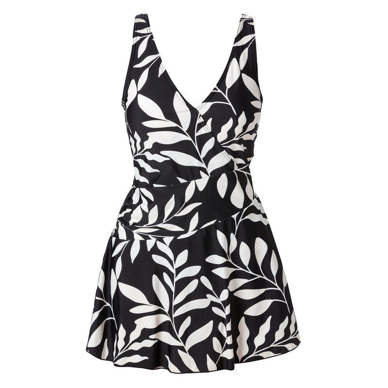 Beskrivelse Badekjole med flatterende sømmer og drapering i midjen. Hel delt underdel. V-formet foran og U-formet bak. Avtakbare skåler. Justerbare skulderstropper. Heldekkende trykk. Kolleksjon: Sjøgress |