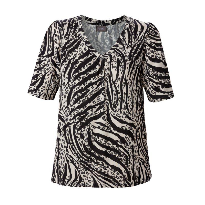 Beskrivelse Topp i myk viskosejersey med semi-korte ermer og grafisk dyretrykk. V-formet hals med dekorative brett foran. Lengde: 65 cm i størrelse M. Denne viskosemodellen er laget av Lenzing EcoVero med bærekraftige viskosefibre. Kolleksjon: Zebra Leo |