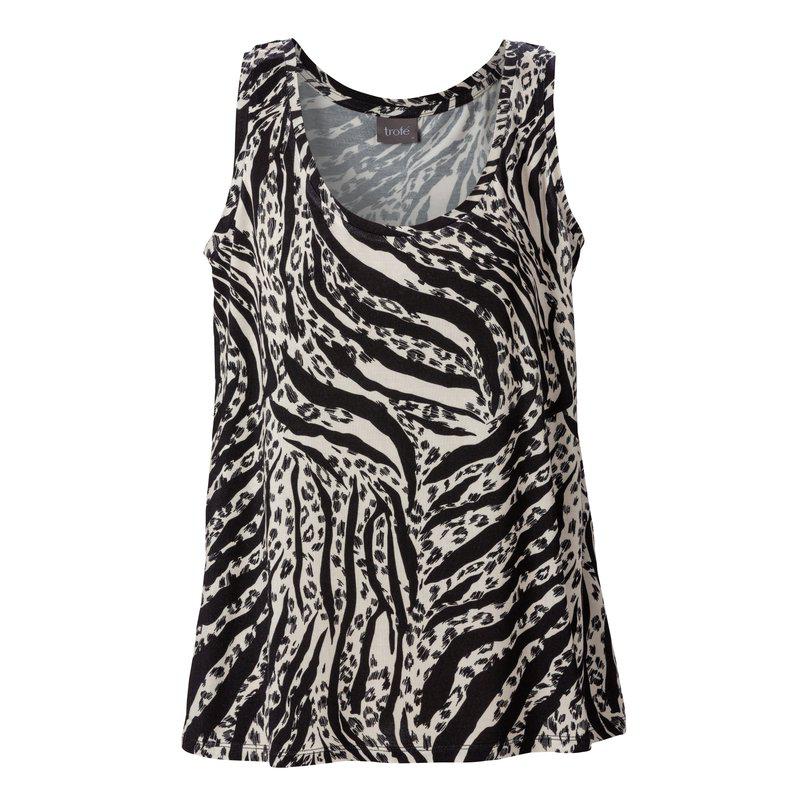 Beskrivelse Ermeløs topp i myk viskosejersey med grafisk dyretrykk. Avrundet hals. Lengde: 63 cm i størrelse M. Denne viskosemodellen er laget av Lenzing EcoVero med bærekraftige viskosefibre. Kolleksjon: Zebra Leo |