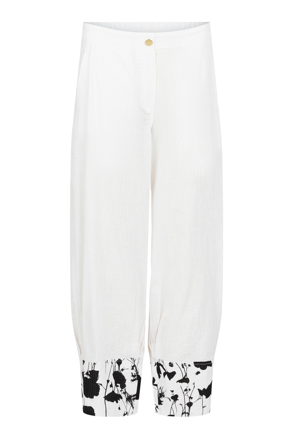 Lekre bukser med litt vidde, men smaler litt inn nederst med mønster i sort/hvitt .