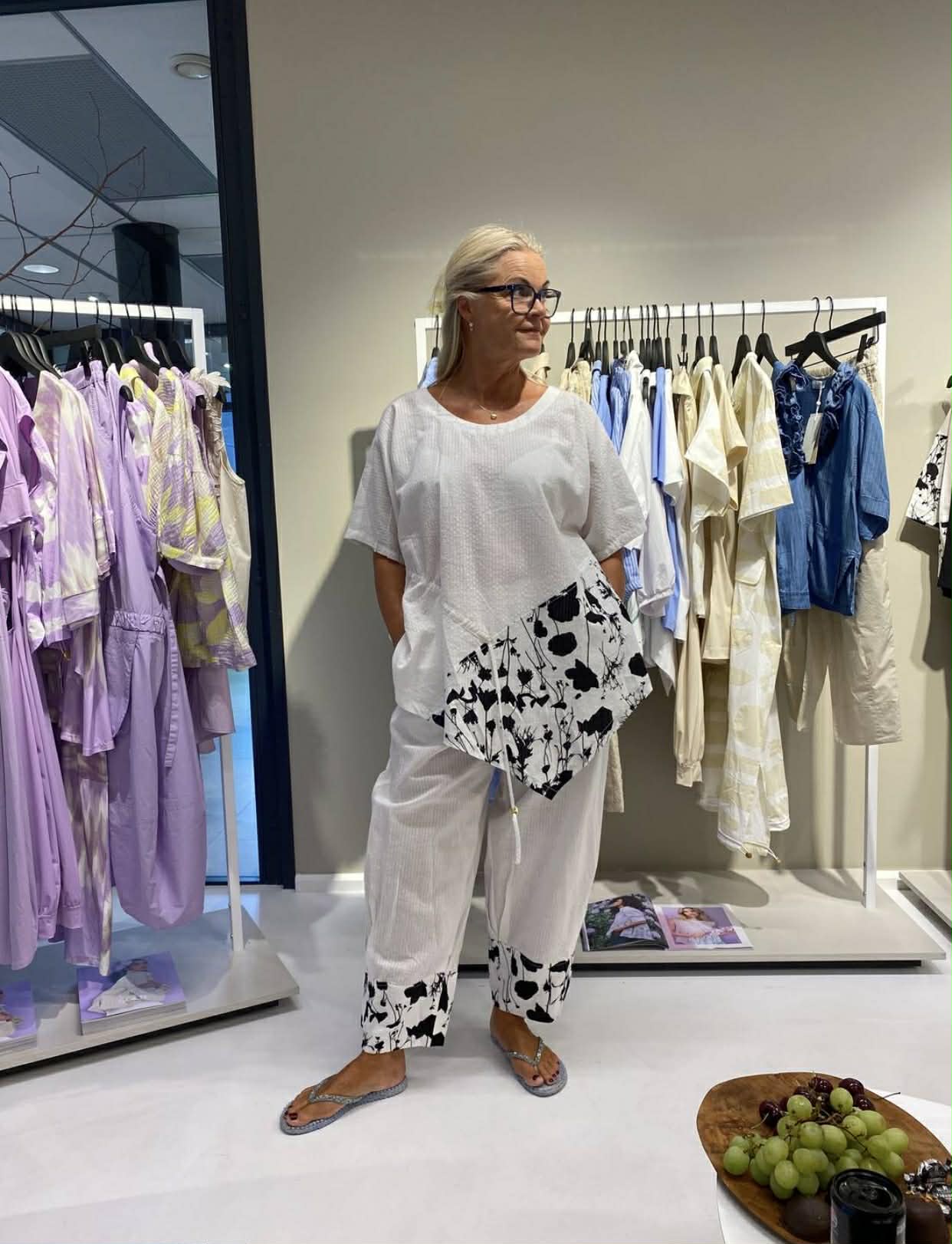 Beskrivelse En lekker tunika med asymmetrisk form, og mulighet for justering på den ene siden. Denne overdelen matcher perfekt til de tilhørende buksene, men klarer seg også godt alene f.eks til jeans. A-fasong- Lengde 86cm. 40%Lin 37%Vikose 23% Bomull |
