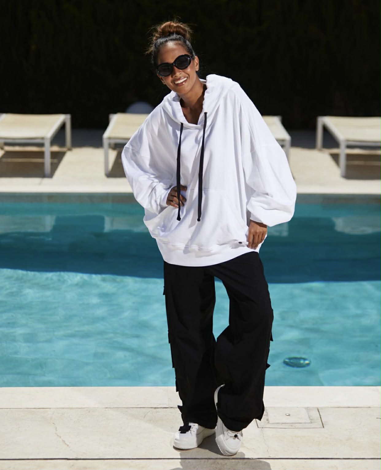 Tøff hettegenser med sort snøring på hetten og kenguru-lomme i front.