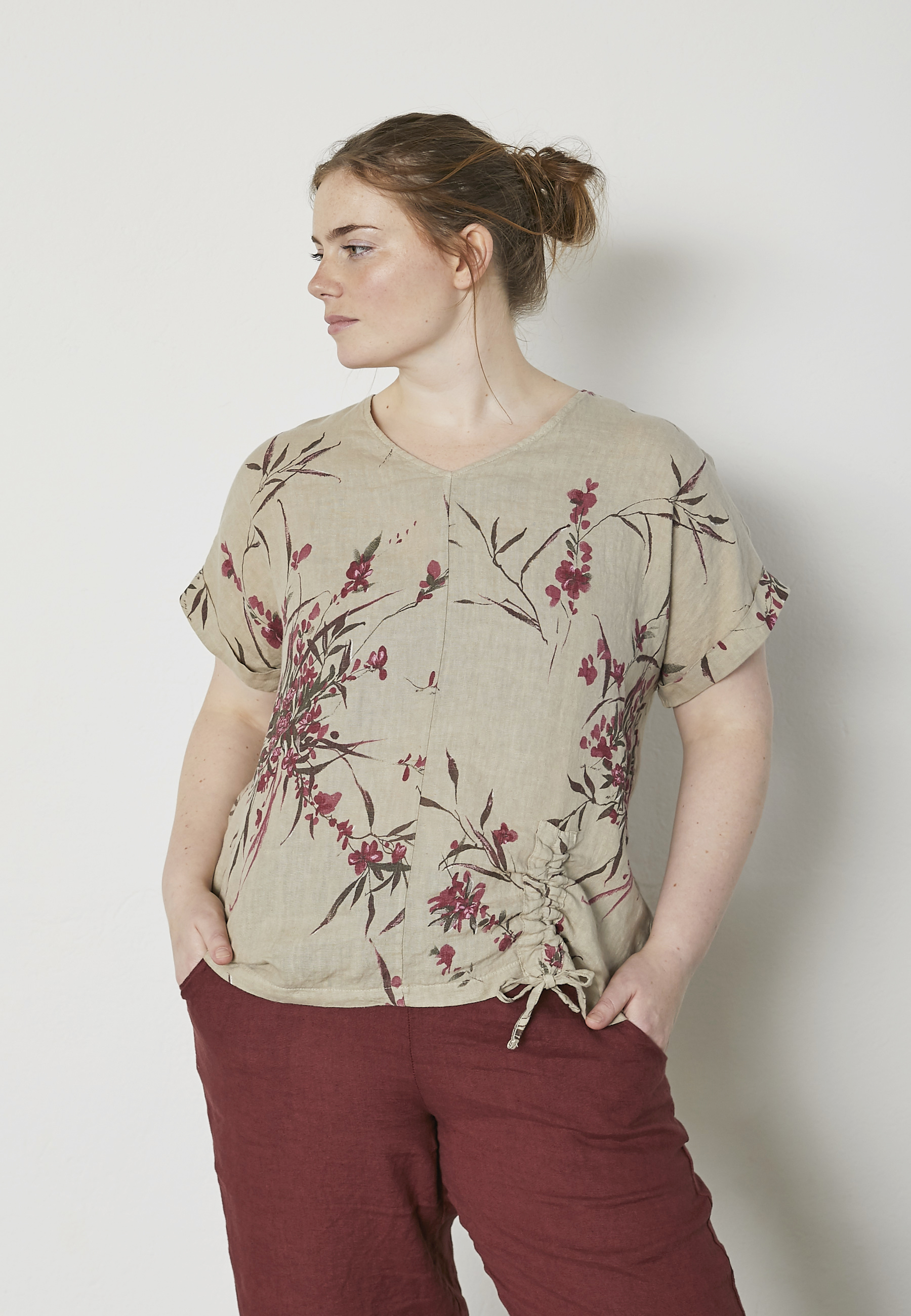 Beskrivelse En vakker bluse med rund hals og korte ermer. Modellen har en oversized silhuett som gir et mykt, avslappet utseende med mye bevegelsesfrihet. Det delikate blomstertrykket gir et feminint preg, mens den rene linkvaliteten gir blusen et lett og naturlig fall. Denne blusen er perfekt for både hverdagsbruk og mer festlige antrekk – kombiner den med lette bukser eller jeans for et uanstrengt og velbalansert uttrykk. Stilen heter PNJasna og er laget av 100 % lin. Passformen er Oversize, og lengden bak er 68 cm i størrelse M. |