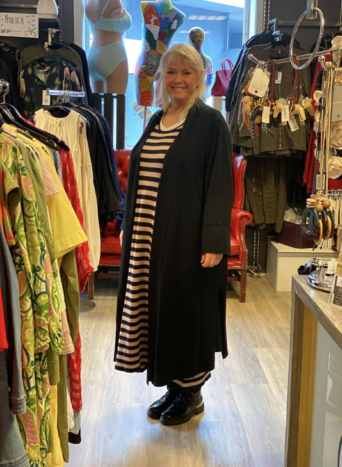 Beskrivelse Lang cardigan med en avslappet silhuett og et rent helhetsinntrykk. Designet har en åpen front og forlenget lengde med mykt fall. Detaljer Halskant / krage: Åpen halskant foran Ermer: Albuelange ermer Lukking: Åpen front Passform: Løs passform Lengde: Til under kneet Designdetaljer: Ren konstruksjon med flytende fall Mykt strikkestoff med glatt overflate og fleksibel struktur. Materialet faller lett og gir komfortabel bevegelse samtidig som det opprettholder den avslappede silhuetten. Materiale: 70 % viskose/30 % polyester |